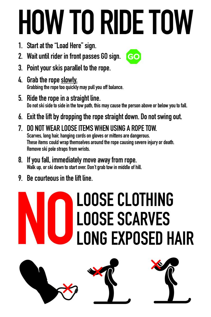 All skis must have either functioning binding breaks or safety straps to ride our tow ropes.