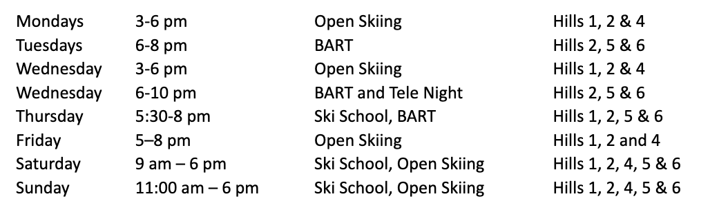 Additional Uphill skiing on Hill 4 is available during these weeknight start times: