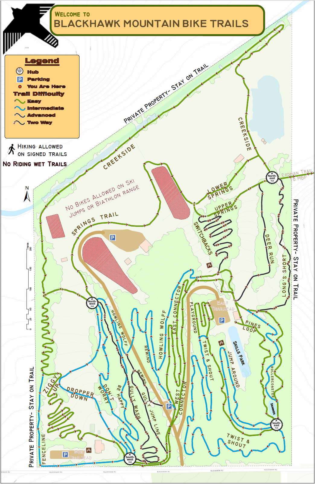 - Driving: 4WD is required to drive to the bottom of Blackhawk and the artificial snow loop. Enter the east driveway (closest to Pleasant View Rd) and stay to the left at the fork, going down the steep hill and passing the Biathlon Haus to the parking area for the ski jumping chalet and machine shed.
